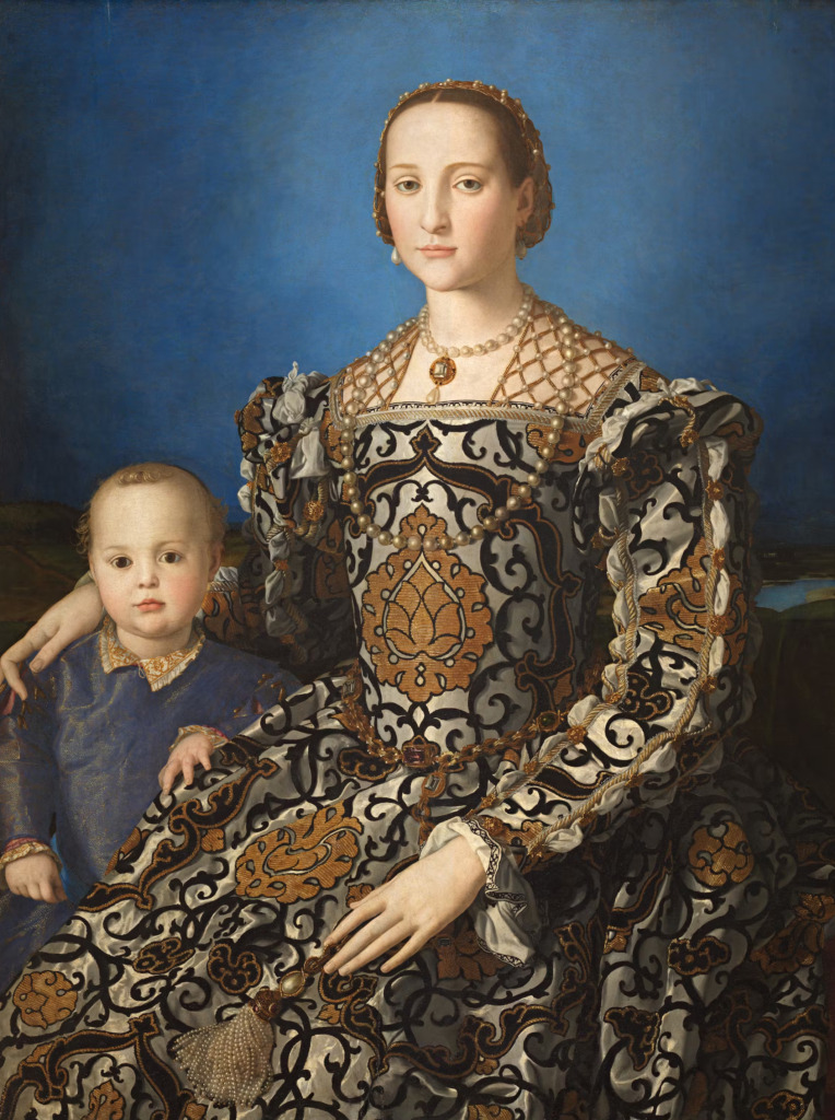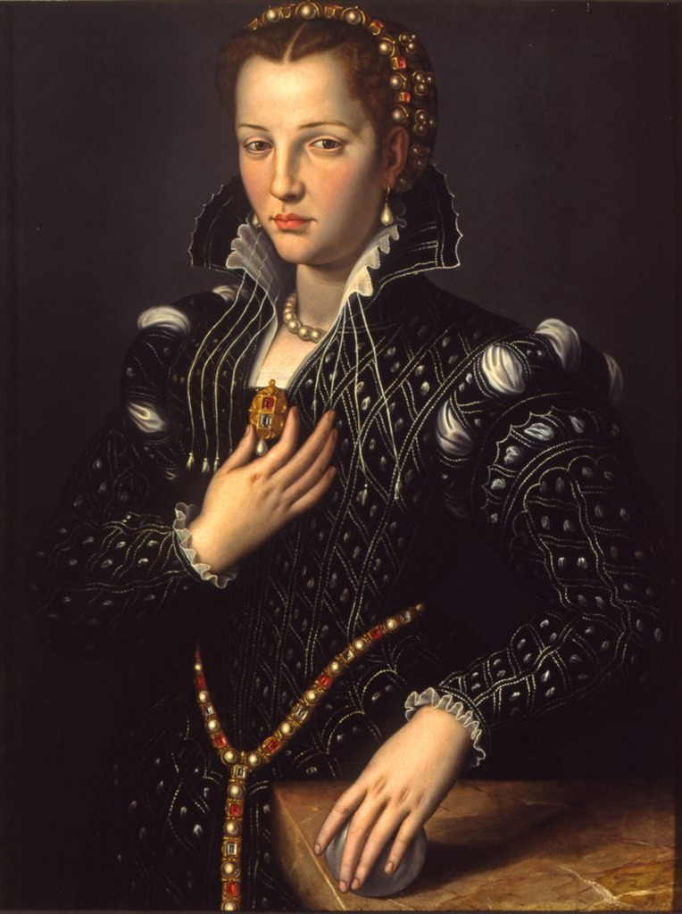 When Cosimo de’ Medici married Eleonora of Toledo in 1539, the union was as much about power as it was prestige. In Bronzino’s 1545 portrait, Eleonora’s gown is offset by lavish jewels: a cascading gem-set belt, layers of pearls and a diamond pendant, marking her visually as a Medici7.