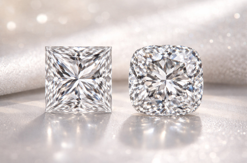 The princess cut and cushion cut may seem similar at first glance, but their shapes tell very different stories.