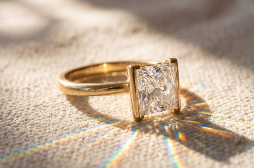 It’s also quietly clever. Princess cuts often deliver more visible carat for less than round cuts, though they do show more warmth. The fix? Choose a color grade that works with your metal, cooler in platinum, warmer in yellow or rose gold. The result? the whole design feels sharper.