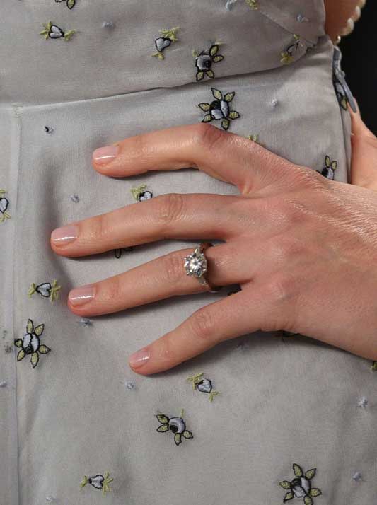 Australian model Miranda Kerr’s refined round brilliant, flanked by tapered baguettes, shows how beautifully the classic center gem can be framed by contrasting shapes. The round remains the focal point, while the baguettes add structure and sophistication.