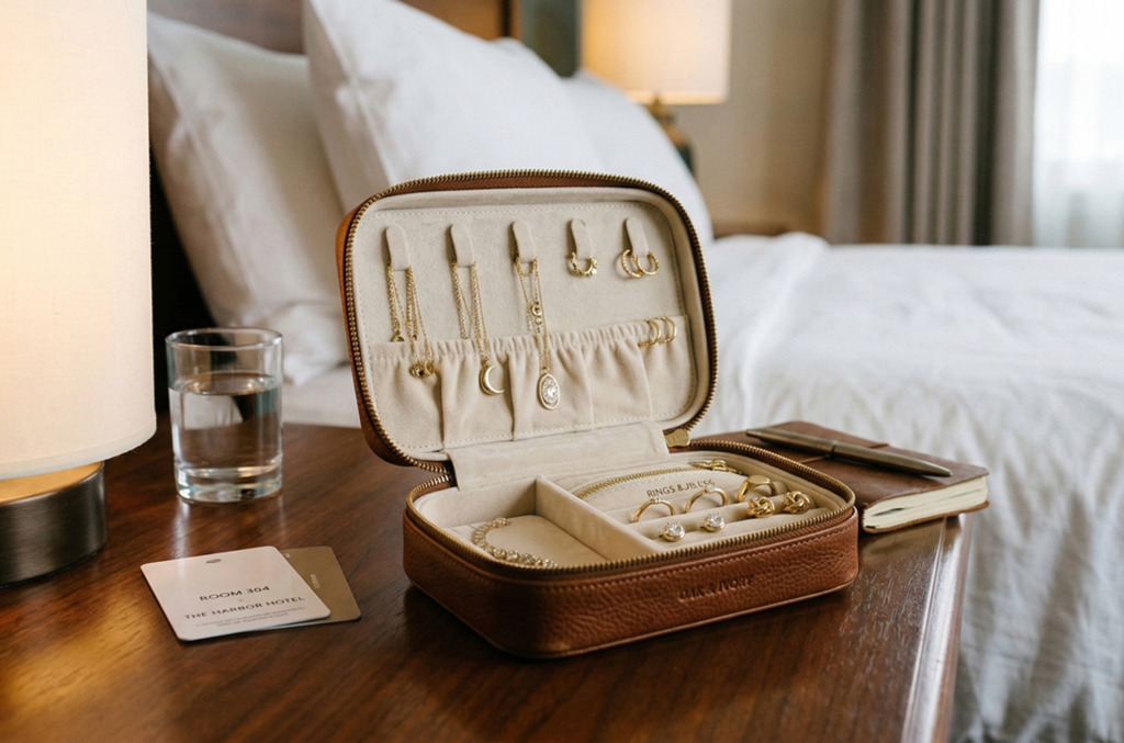 A structured jewelry box with individual sections and anti-tarnish lining is ideal. It cushions each piece, keeps chains from knotting, and protects metals from tarnish or moisture.