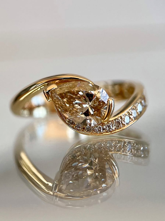 Within the 4 C’s of diamonds, cut is everything. Radiant cuts amplify brilliance, their many facets catching light in a way that magnifies Champagne’s inner fire. Cushion cuts, with their softened edges, mirror the diamond’s warmth and add a romantic softness. Emerald cuts offer the opposite: clean lines and broad facets, perfect for the fashion-forward minimalist. For those after showstopping sparkle, a round brilliant will always flatter, while oval and pear shapes play beautifully with light, stretching Champagne’s glow across the finger4.