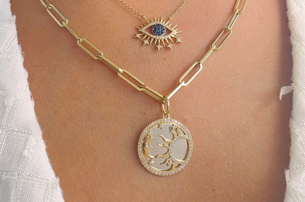 A lunar or solar motif in yellow gold with pavé diamond stars feels personal and a little magical. Wear it layered or solo; either way, it travels well. We recommend a 16 to 18″ chain for daily wear10.