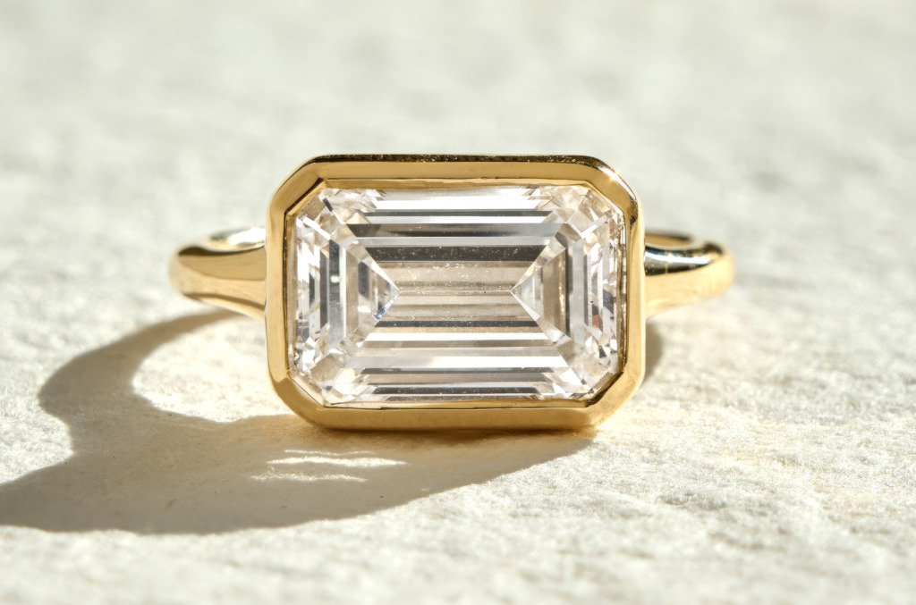 An East-West diamond button-back ring in both white and yellow gold. Mixed metals? Check. Unexpected setting? Double check.