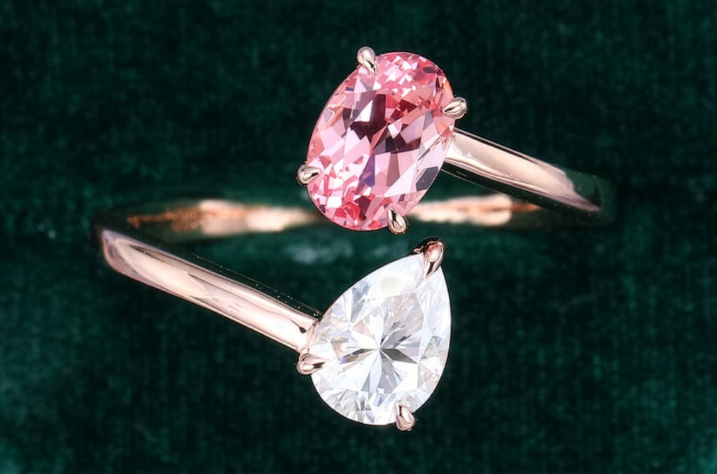 A diamond and birthstone toi et moi ring is both intimate and symbolic. Think Ariana Grande’s oval diamond and pearl ring: the pearl is her birthstone and is said to come from her grandfather’s tie pin4. Sentimental, but cool.