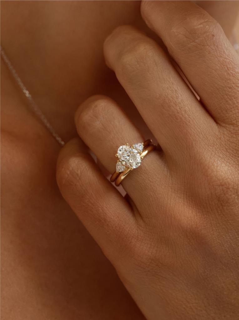 Width and thickness also shift how a stack feels. Two slim bands can look modern and refined. A wider wedding band paired with a delicate engagement ring can feel grounded and architectural. Mixed metals introduce contrast; matching metals emphasizes cohesion.