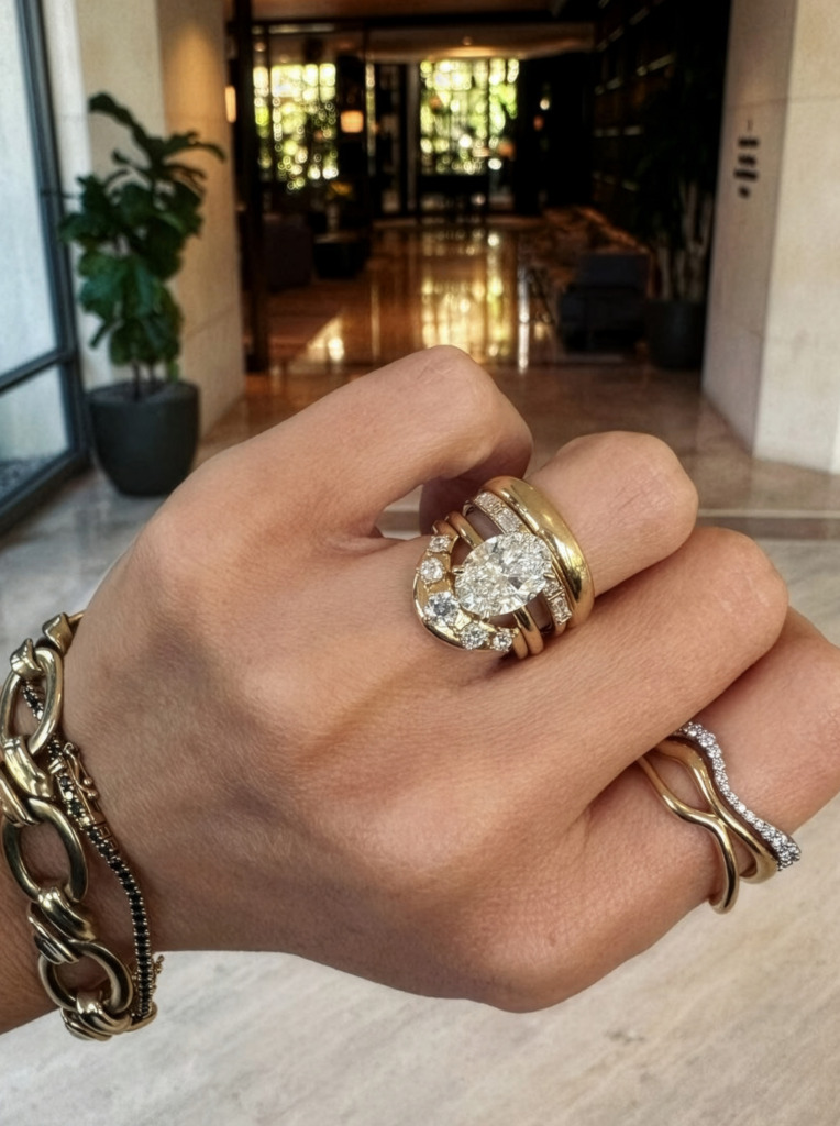 Stacking is where symbolism meets styling. There is the traditional order — wedding band first, closest to the heart, engagement ring above it — but there is also proportion, silhouette and wearability to consider.