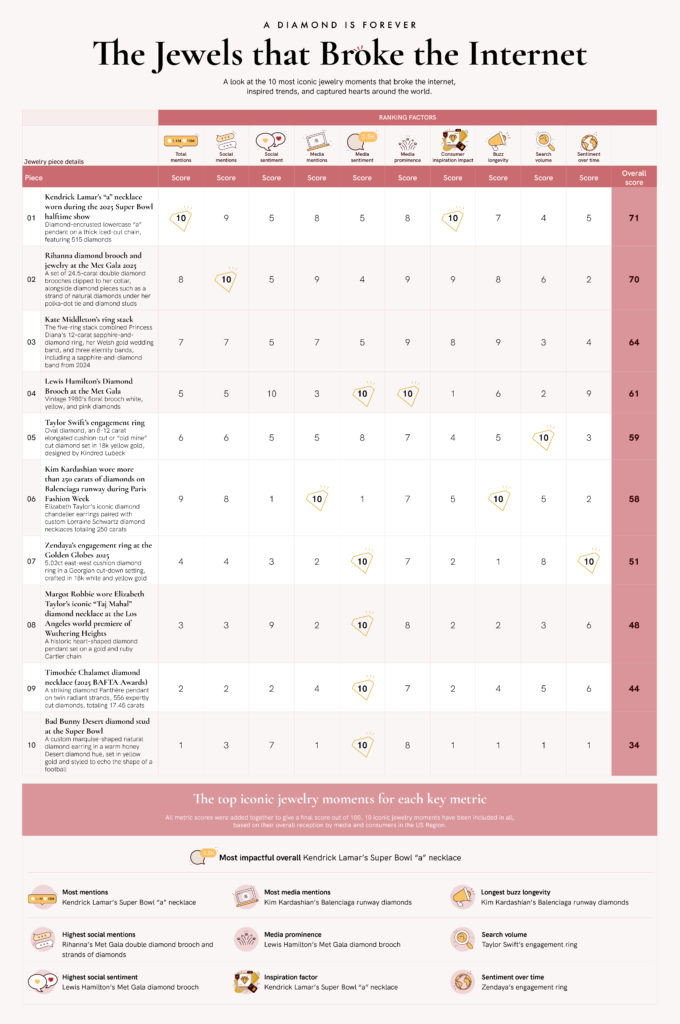 Each jewelry moment was selected based on its overall reception among U.S. media and consumers over the past year, using data from YouScan, Google Trends and news monitoring tools to identify the most visible and culturally resonant diamond moments.
