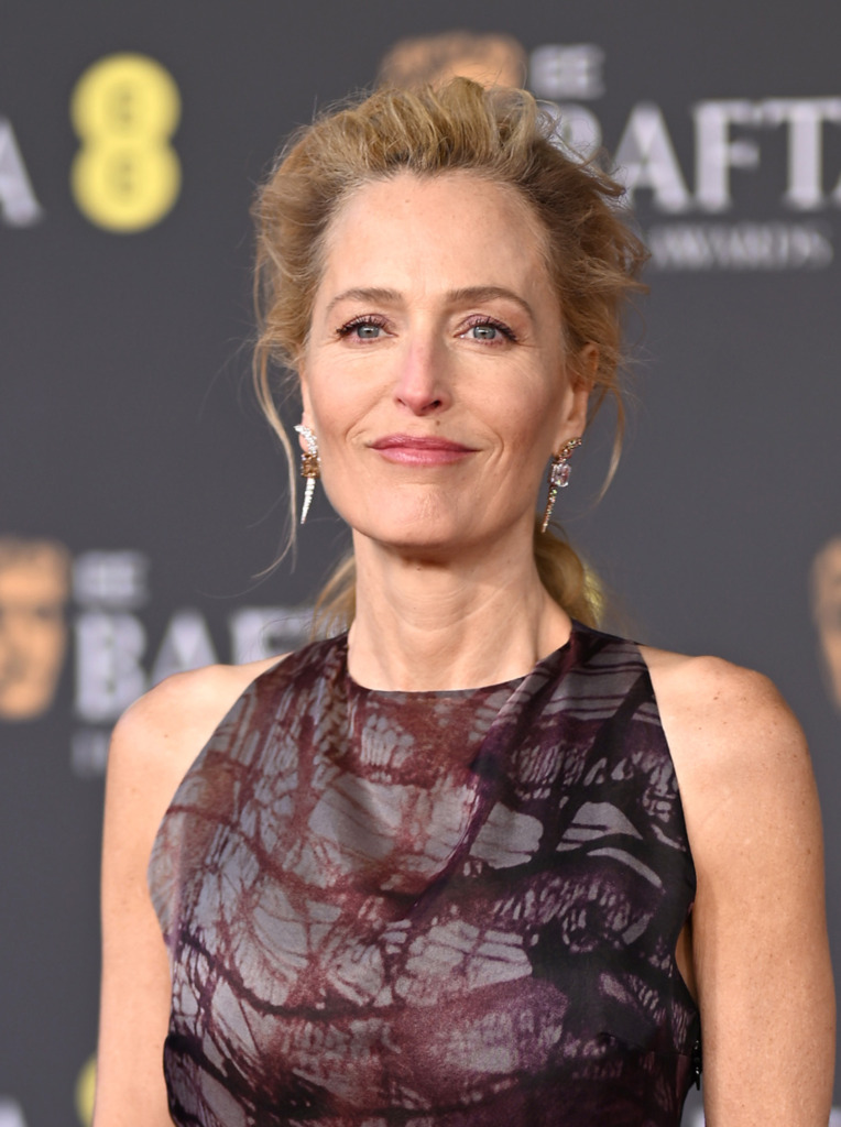 This year’s carpet was no exception. Gillian Anderson arrived in a printed Roksanda gown, its abstract brushstroke pattern moving through plum, charcoal and bruised purple tones. Against that depth of color, her Ara Vartanian asymmetric earrings featuring warm brown natural Desert diamonds completed the look rather than competed with it.